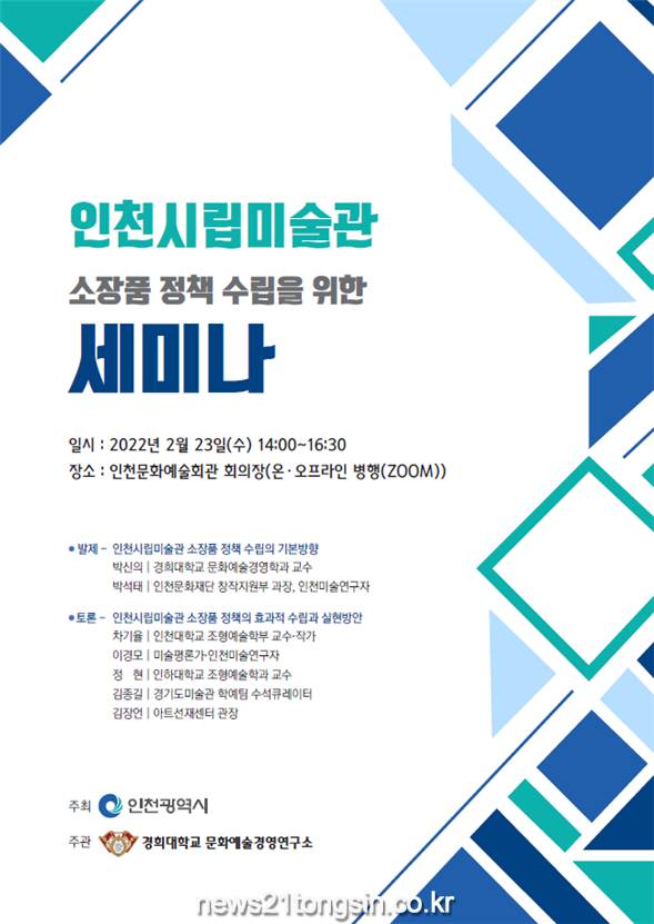 인천광역시는 「인천시립미술관 소장품정책 연구용역」 관련 세미나를 오는 23일(수) 오후 2시에 인천문화예술회관에서 개최한다고 밝혔다.