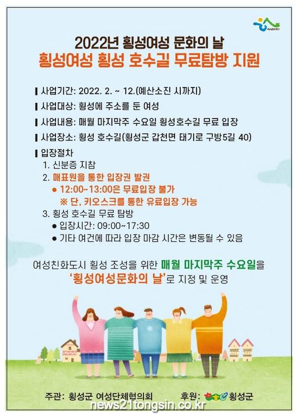 횡성군은 관내 여성들에게 다양한 문화 향유의 기회를 제공하고자 매월 마지막 주 수요일을‘횡성여성 문화의 날’로 지정 운영하는 가운데, 횡성호수길 무료입장 지원사업을 신규 추진한다고 밝혔다.