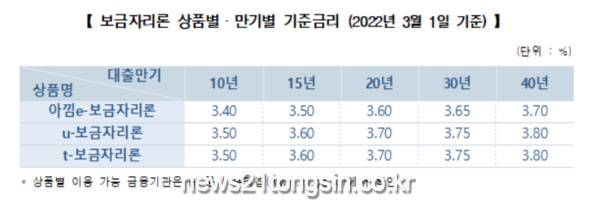 한국주택금융공사(HF, 사장 최준우)는 장기 고정금리·분할상환 주택담보대출인 ‘보금자리론’의 3월 금리를 전월 대비 0.30% 포인트 인상한다고 22일 밝혔다.