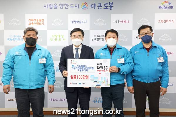 ▲ 사진=도봉구도봉구(구청장 이동진)가 2022년 2월 24일 구청 소통협력실에서 자동차전문정비조합 도봉구 지회(카포스 도봉지회, 지회장 김시경)로부터 따뜻한 겨울나기 성금 1백만 원을 전달받았다.