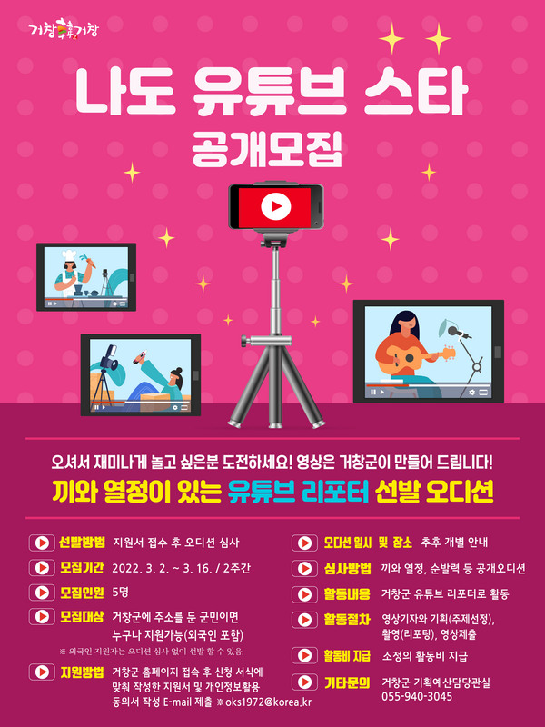 구인모 거창군수는 “코로나19가 2년 넘게 지속되면서 군정홍보도 대면에서 비대면으로 바뀌고 있고 특히, 유튜브의 영향력이 점점 커지면서 유튜브 크리에이터를 꿈꾸는 사람들이 많아졌다”며, “이런 분위기를 반영해 끼와 열정이 있는 군민을 유튜브 스타로 발굴하고 군정홍보에 직접 참여할 수 있는 기회를 제공하고자 한다”고 군민들의 많은 관심과 참여를 당부했다.