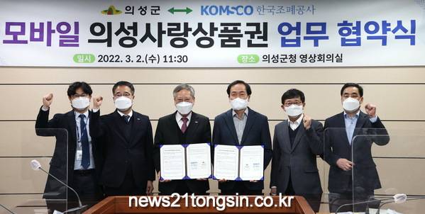 의성군은 모바일형 의성사랑상품권 출시를 위해 한국조폐공사와 3월 2일 의성군청 영상회의실에서 업무 협약을 체결하고 한국조폐공사 임직원 사랑의 기부금 3백만원을 전달받았다.
