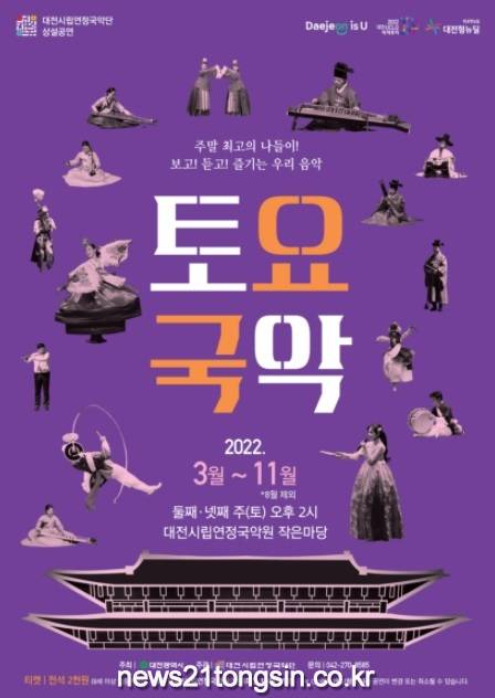 대전시립연정국악단은 3월부터 11월까지(8월 제외) 매월 둘째, 넷째 주 토요일 오후 2시에 국악원 작은마당에서 상설공연‘토요국악’으로 관객을 맞이한다.
