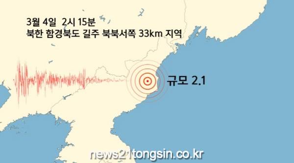 4일 기상청에 따르면 이날 오전 2시 15분쯤 북한 함경북도 길주 북북서쪽 33km 지역에서 규모 2.1의 지진이 발생했다고 밝혔다.