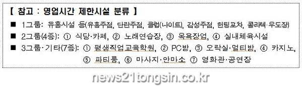 이에 따라, 1‧2·3그룹 및 기타 그룹 운영시간은 현행 22시에서 23시까지 1시간 연장 조정되며, 그 외 사적모임, 행사·집회 등 나머지 조치는 현행대로 유지된다.