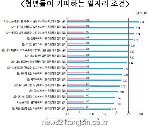 조사 분석 결과, 청년들이 가장 기피하는 일자리 조건은 정시근무가 지켜지지 않는 직장(2.94점/4점), 불편한 통근 환경(2.74점/4점), 본인 기대보다 낮은 월급(2.74점/4점), 비정규직(2.68점/4점), 주 5일 근무가 아닌 직장(2.55점/4점) 순으로 나타났다.