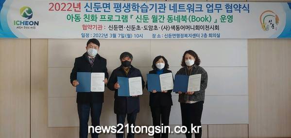 이천시 신둔면 평생학습센터는 아동친화 프로그램 운영을 위한 지역 기관 및 단체와의 협업 프로젝트 사업으로 신둔 월간 학습 ‘월간 동네북’운영을 위하여 신둔초, 도암초, 색동어머니회, 신둔면 등 4개 기관이 업무 협약식을 개최하였다.