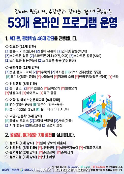 부평구노인복지관(관장: 최민수)은 대면으로 진행하려던 평생학습과 여가문화 프로그램을 오미크론 방역대책에 따라 인기강좌 53개를 선정 온라인 교육을 통해 어르신들에게 다양한 학습기회를 제공한다고 밝혔다.