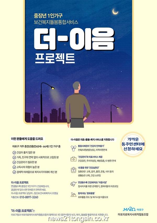 마포구(구청장 유동균)는 사회적으로 고립된 중장년층 1인 가구를 대상으로 ‘1차 의료’와 ‘사회적 돌봄’을 결합한 ‘더-이음 프로젝트’를 운영한다고 11일 밝혔다.