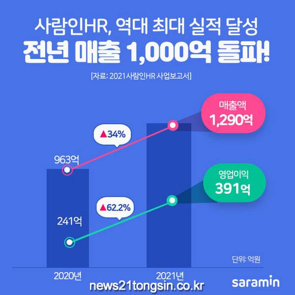 사람인HR은 지난해 연결기준 매출 1,290억원, 영업이익 391억원을 기록했다고 15일 밝혔다. 전년 대비 매출은 327억원, 영업이익은 150억원 증가해 창사 이래 처음으로 매출 1,000억원을 돌파했다.
