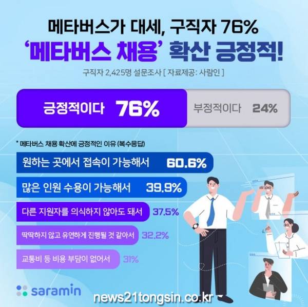 삼성바이오로직스, CJ올리브네트웍스 등 다수의 기업이 메타버스 채용 설명회를 진행하고, 한화시스템, 세븐일레븐은 메타버스를 활용해 신입사원 면접을 진행하는 등 채용 시장에도 메타버스 바람이 불고 있다. 이에 커리어테크 플랫폼 사람인(www.saramin.co.kr 대표 김용환)이구직자 2,425명을 대상으로 ‘메타버스 채용 확산에 대한 의견’을 조사한 결과, 76%가 긍정적이라고 답했다.