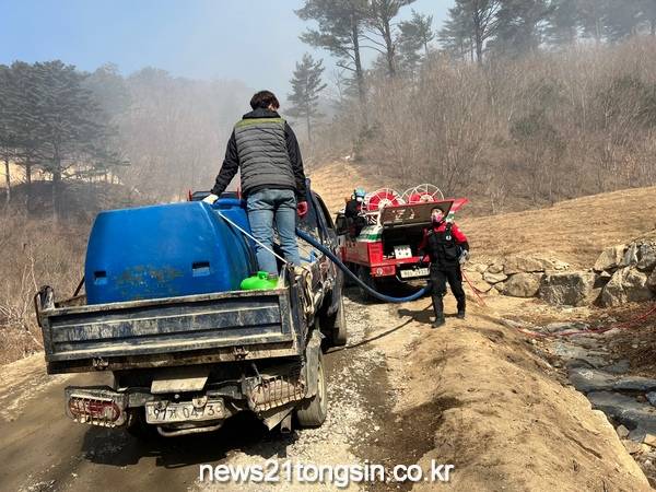특히, 화선이 소광리 금강송군락지로 일부 넘어와 한 대의 진화차량이 아쉬운 상황에서 산불진화차가 계속해서 그 자리를 지킬 수 있도록 좁은 산길을 다니며 소방물차와 산불진화차를 연결하는 중요한 가교 역할을 했다.
