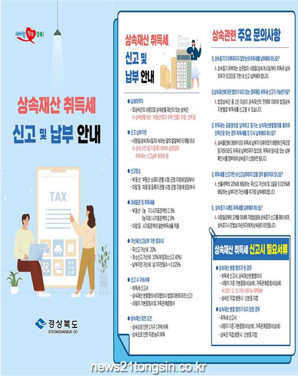 경상북도는 상속재산에 대한 취득세 자진 신고납부를 유도하고 누락세원을 방지하기 위하여 상속 취득세 관리를 강화한다고 밝혔다.