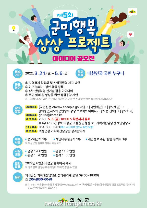 의성군은 군민의 행복증진과 중장기적 지역발전을 위해 제5회 군민행복 상상 프로젝트 아이디어 공모전을 개최한다고 밝혔다.