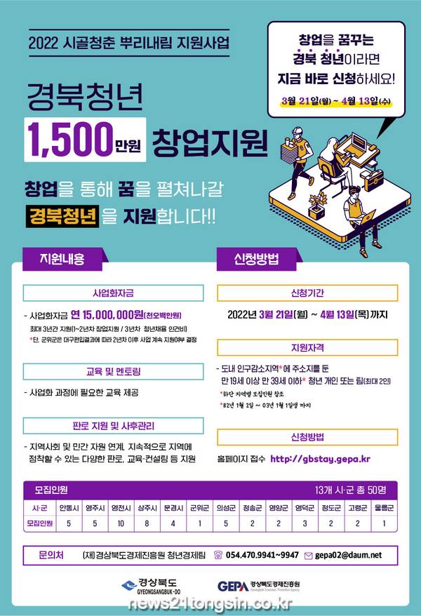 모집대상은 사업 공고일 기준 경북도 내 인구감소지역(의성군 외 15개소)에 주소지를 둔 만 19세~39세 이하의 미취업 청년으로 개인 또는 팀(최대 2인)단위로 참여가 가능하며, 모집기간은 3월 21일부터 4월 13일까지다.