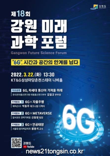 강원도는 3. 22.(화) 오후 1시 30분부터 상상마당춘천스테이 나비홀에서 “6G, 시간과 공간의 한계를 넘다”라는 주제로 「제18회 강원 미래 과학 포럼」을 개최한다.