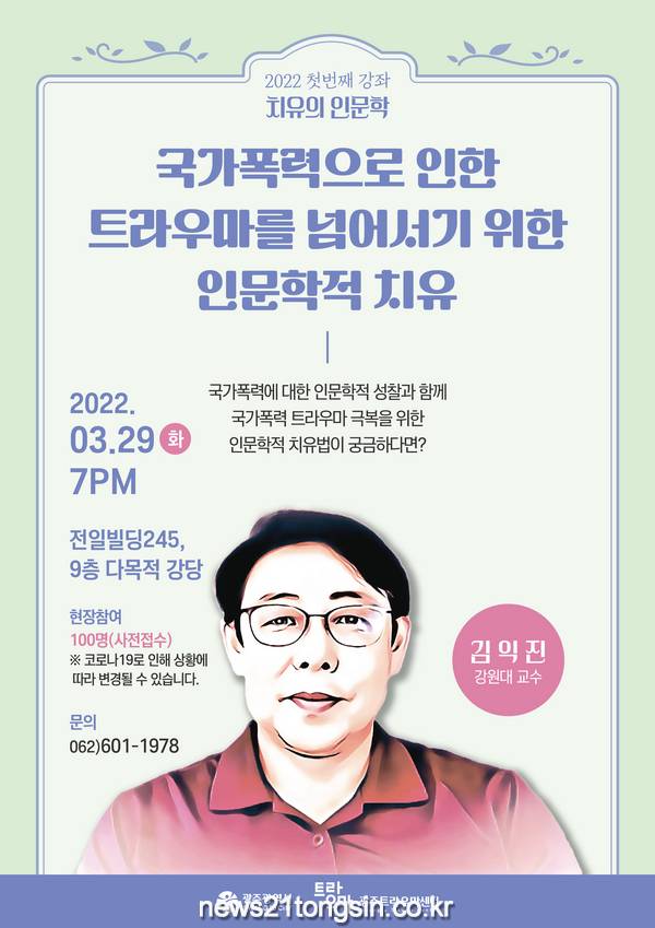 광주광역시는 29일 오후 7시 전일빌딩 245 9층 다목적 강당에서 김익진 강원대학교 교수를 초청해 2022년 첫 번째 광주트라우마센터 치유의 인문학 강연을 진행한다.
