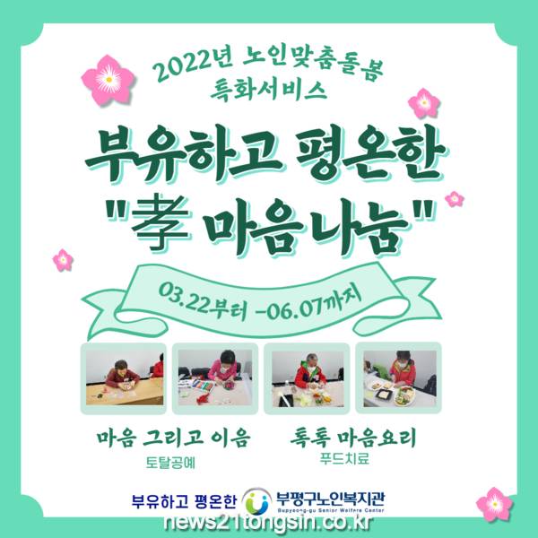 부평구노인복지관(관장: 최민수)은 오는 6월 7일까지 주별 3회씩 취약계층 어르신을 대상으로「孝 마음 나눔」이라는 주제로 미술치료인 ‘마음 이음’과 푸드 예술치료인 ‘톡톡 마음요리’를 진행한다고 밝혔다.