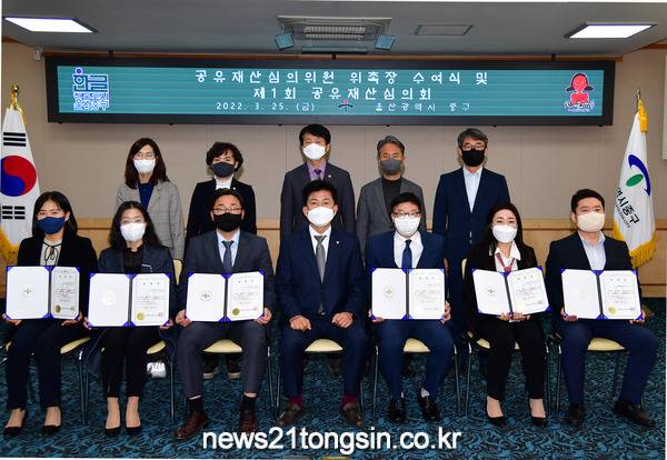 (뉴스21통신/박형만기자) =공유재산심의회 위원 위촉장 수여식 및 제1회 제1회 공유재산심의회가 25일 중구청 중회의실에서 열린 가운데 박태완 중구청장이 중구 공유재산심의회 위원들에게 위촉장을 수여한 뒤 기념촬영을 하고 있다.