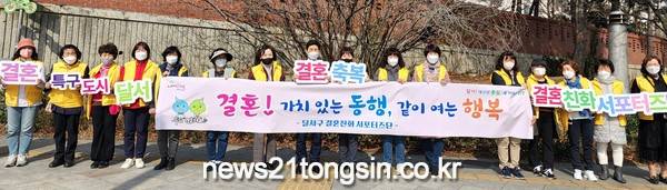 (대구=뉴스21통신) 박창남기자 = 달서구는 지난 25일 긍정적 결혼문화 확산을 위해 이곡역네거리에서 결혼친화 서포터즈단과 함께 결혼장려 홍보 캠페인을 전개했다고 밝혔다.
