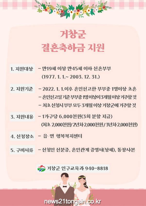 거창군은 4일 청년 생활 안정 지원과 결혼 장려 분위기 조성을 위해 가구당 최대 600만 원의 결혼축하금을 지원한다고 전했다.