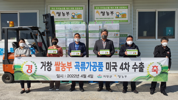 거창군은 지난 4일 쌀농부 공장에서 행복농촌과장, 쌀농부 대표 및 수출관계자 등이 참석한 가운데 곡류가공품 미국 4차 수출 선적식을 가졌다고 5일 전했다.