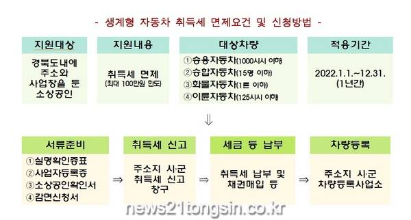 취득일 현재 경북에 주소와 사업장을 두고 사업자등록을 한 소상공인이 ▷배기량 1000시시 이하 승용자동차 ▷승차정원 15명 이하 승합자동차 ▷최대적재량 1톤 이하 화물자동차 ▷배기량 125시시 이하 이륜자동차를 취득하는 경우 먼저 감면 신청하는 1대에 대해 올해 12월 31일까지 감면을 하고, 취득세액이 100만원을 초과하는 경우 100만원까지 감면한다.