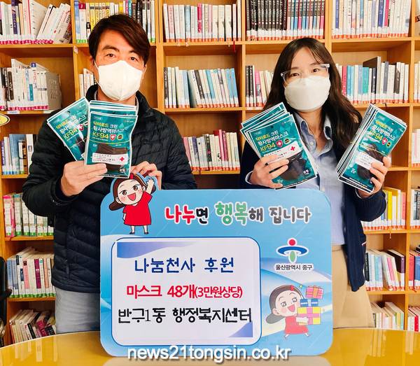 (뉴스21통신/박형만기자) = 울산시 중구 반구1동 익명의 나눔천사가 4월6일 반구1동 행정복지센터(동장 홍정식)를 찾아 어려운 이웃을 위해 써달라며 마스크 48장을 전달했다. 반구1동 행정복지센터는 어려운 이웃을 위한 주민들의 훈훈한 선행이 이어지고 있다고 밝혔다.