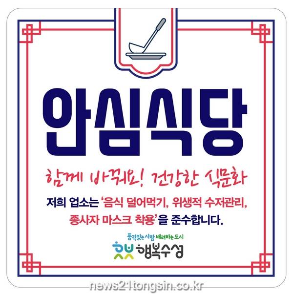 (뉴스21통신) 유재원기자 = 대구 수성구는 코로나 19 확산을 방지하고, 감염병에 취약한 식사문화를 개선하기 위해 주민들이 안심하고 찾을 수 있는 안심식당 80개소를 5일부터 선착순 모집한다.