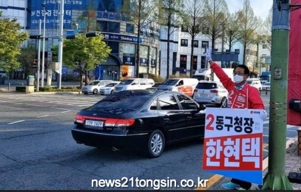 한현택 동구청장 예비후보가 12일 오전 용전네거리에서 거리유세를 펼치고 있다.
