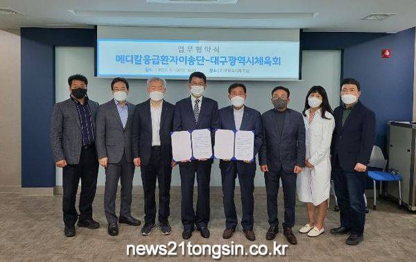 (뉴스21통신) 유재원기자 = 대구광역시체육회는 12일(화) 대구시체육회관에서 주식회사 ‘메디칼응급환자이송단’과 안전한 체육 행사 지원 체계 구축을 위한 협약을 체결했다.