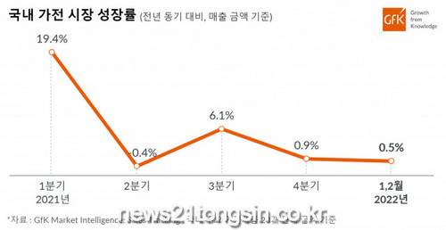 분기별로 살펴보면 2021년 1분기 19.4%(2020년 같은 기간 대비)의 성장률을 보인 뒤 에어컨 판매 호조로 판매가 증가했던 2020년 3분기를 제외하면 국내 가전 시장 규모는 전년 같은 기간 대비 큰 변화를 보이지 않고 있다. 2021년 4분기는 전년 같은 기간 대비 0.9% 성장, 2022년 1월과 2월엔 0.5% 성장에 그쳤다.