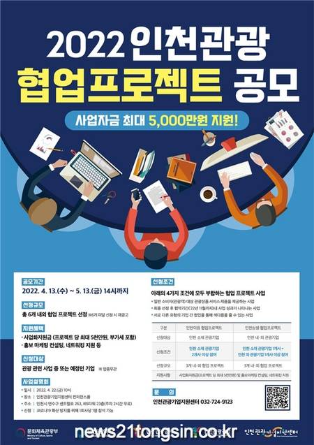 인천광역시와 인천관광공사는 한국관광공사 경인지사와 함께 인천관광을 주제로 관광기업 간의 상생․협업을 위한 「인천관광 협업프로젝트 공모」를 4월 13일부터 추진한다고 밝혔다.