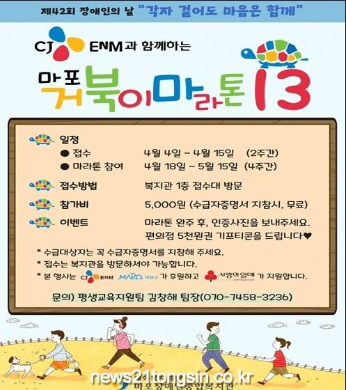 올해로 13회를 맞이하는 ‘마포거북이마라톤’은 오는 18일부터 내달 15일까지 4주간 열리며, 마포장애인종합복지관이 주관하고 마포구와 CJENM이 후원한다.