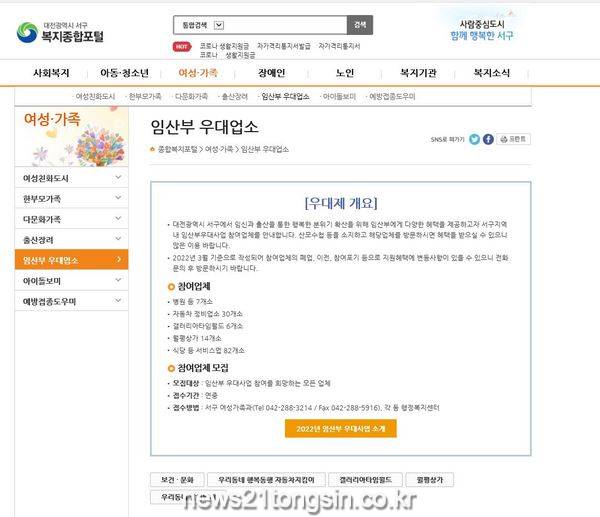 대전 서구는 ‘임산부 우대사업’에 참여하는 지역 업체의 홍보효과 개선을 위해 구청 홈페이지에 해당 업체의 위치 표시 및 바로 가기 링크를 지원한다고 14일 밝혔다.