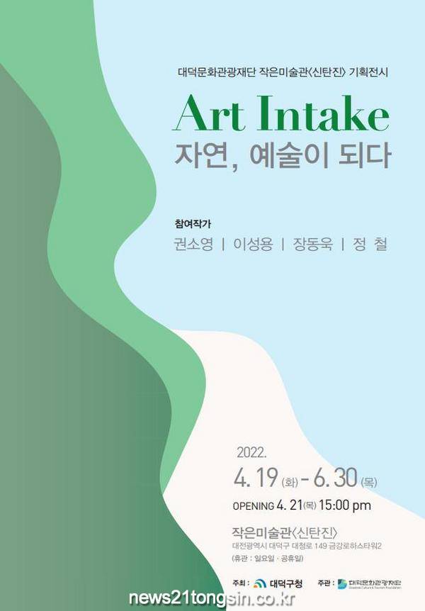 대덕문화관광재단은 오는 19일부터 6월 30까지 작은미술관 ‘신탄진’에서 ‘Art Intake – 자연, 예술이 되다’와 미디어 아트전 ‘Flat Water’을 개최한다. 개막식은 오는 21일 오후 3시에 작가와의 만남 등의 행사로 진행된다.