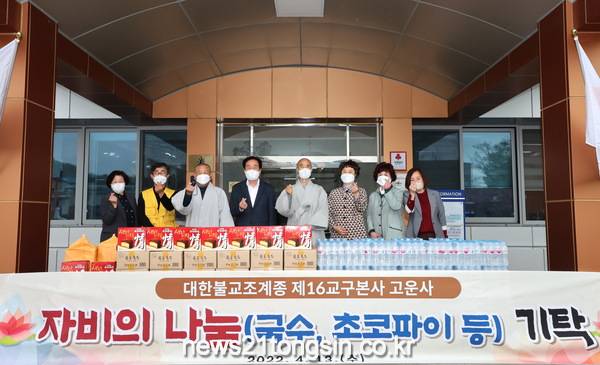 의성군은 대한불교조계종 제16교구 본사 고운사가 불기2566년도 부처님오신 날을 맞이하여 지난 13일 군청 전정에서 국수 50박스, 초코파이 100박스, 생수 1,000병 등 200만원 상당의 자비·나눔 식품을 기탁했다고 밝혔다.