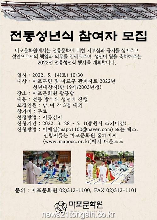마포구(구청장 유동균)는 성년의 날을 맞아 오는 5월 14일에 광흥당(마포구 독막로 21길 15)에서 ‘전통성년식’을 개최한다고 14일 밝혔다.