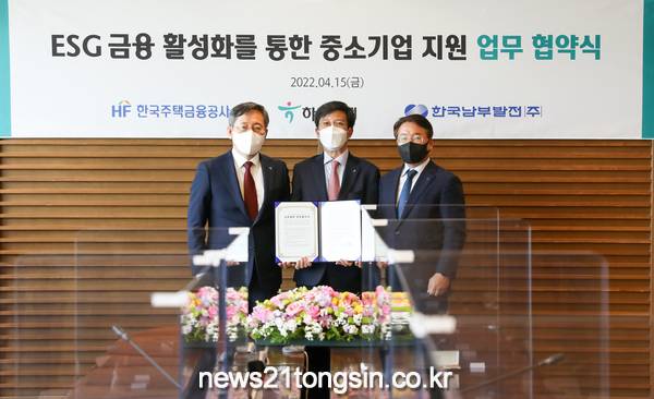 주택금융공사(HF, 사장 최준우)는 한국남부발전(사장 이승우)·하나은행(은행장 박성호)과 함께 ‘ESG 금융 활성화를 통한 중소기업 지원 업무협약‘을 체결했다고 지난 15일 밝혔다.