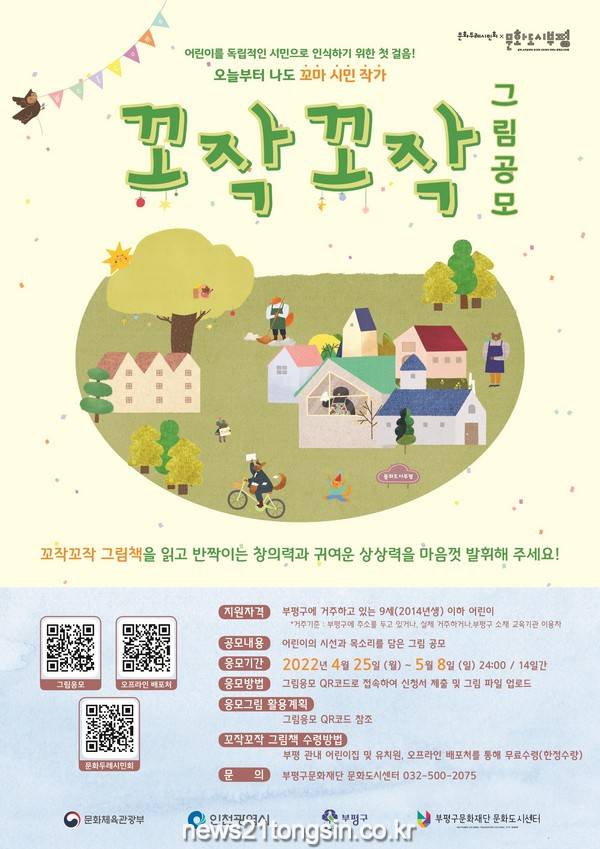 부평구 문화도시센터는 문화도시부평 시민거버넌스 ‘문화두레시민회’ 사업 일환으로 오는 25일부터 5월 8일까지 부평의 꼬마 시민 작가 발굴을 위한 ‘꼬작꼬작’ 그림 공모를 진행한다.
