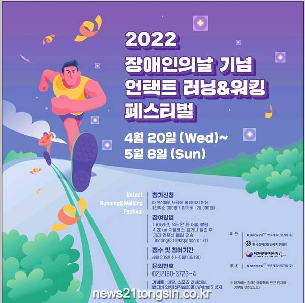 대한장애인체육회는 4월 20일부터 5월 8일까지 열리는 ‘2022 장애인의 날 기념 언택트 러닝·워킹 페스티벌’에 동참한다고 밝혔다.