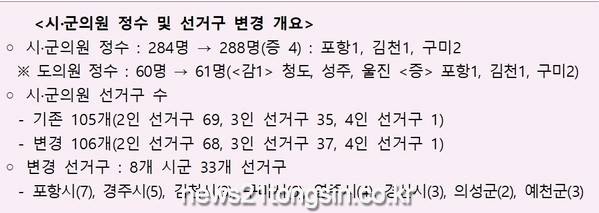한편, 시․군의회의원 선거구와 의원정수는 조례 개정 사항으로 경북도가 조례안을 도의회에 제출하면, 경북도의회는 이달 28일 조례안 심의를 위한 원포인트 임시회를 개최할 예정이다.
