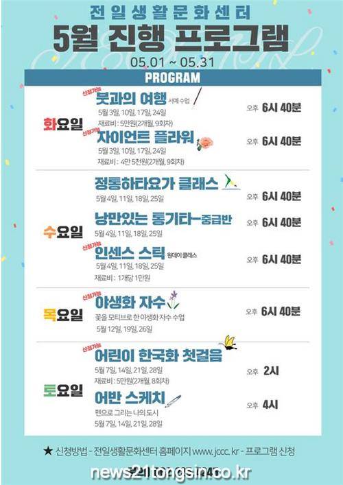 이와 함께, 4월 현재 진행되고 있는 ‘낭만있는 통기타’, ‘정통하타요가’, 꽃을 모티브로 한 ‘야생화 자수’, 나의 도시를 펜으로 그리는 ‘어반스케치’ 강좌는 5월에도 계속 운영된다.