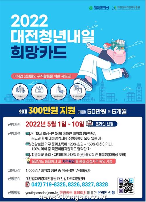 대전시가 대전 거주 미취업 청년의 구직활동 및 생활안정 지원을 위해 2022년‘대전시 청년내일희망카드사업’ 참여자를 모집한다고 밝혔다.