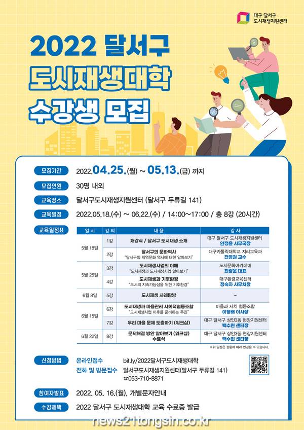 (대구=뉴스21통신) 박창남기자 = 달서구는 5월 18일부터 6월 22일까지 매주 수요일 오후 2시에 도시재생에 관심 있는 주민을 대상으로 「2022 달서구 도시재생대학」을 운영한다.
