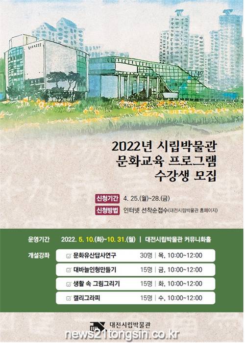 대전시립박물관 관계자는 “2020년 코로나로 인한 사회적 거리두기가 시작된 이후 시립박물관은 폐관과 관람객 제한 등 침체기를 겪어온 만큼 이번 사회적 거리두기 해제에 맞춰 많은 시민들이 시립박물관을 찾아 생활의 여유를 즐겼으면 좋겠다”고 말했다.
