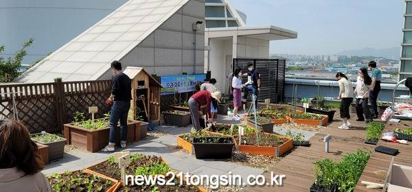 청사 6층에 조성된 옥상텃밭은 상자텃밭 13개와 화분텃밭 20개로 구성됐으며, 텃밭 참여를 희망한 부서에서 공동 관리할 계획이다.