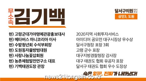 김기백 달서구의원 예비후보는 “지역주민 소상공인들의 위한 조례를 만들고, 구민들의 민원을 일사천리로 해결하는 생활정치를 하는 일꾼으로 구민들에게 다가가 적극적으로 지원할 수 있도록 하겠다.”고 말했다.