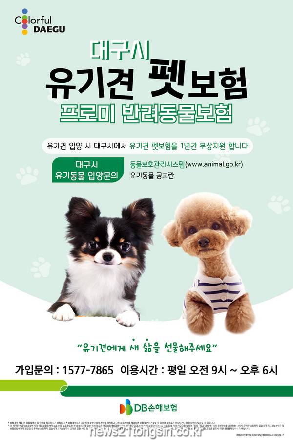 신청 대상은 대구시 지정 동물보호센터에서 올해 유기견을 입양한 시민으로, 가입신청은 오는 12월 31일까지 가능하며, 보험기간은 신청일로부터 1년간이다.
