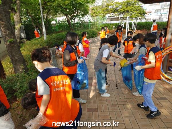 (대구=뉴스21통신) 박창남기자 = 달서구 두류1·2동(동장 이명희)은 28일 아침 등교시간에 내당초등학교 학생들과 함께 통학로 주변 및 능금공원 일대를 조깅하면서 청소하는「두류1·2동 플로깅(plogging) 챌린지 활동」을 실시했다.